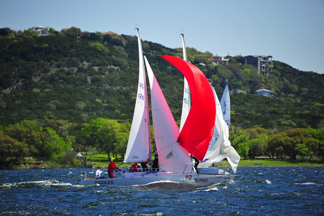 J/24s racing on Lake Travis: First downwind leg of the 2016 J/24 March Madness Regatta. Photo courtesy of Bill Records.