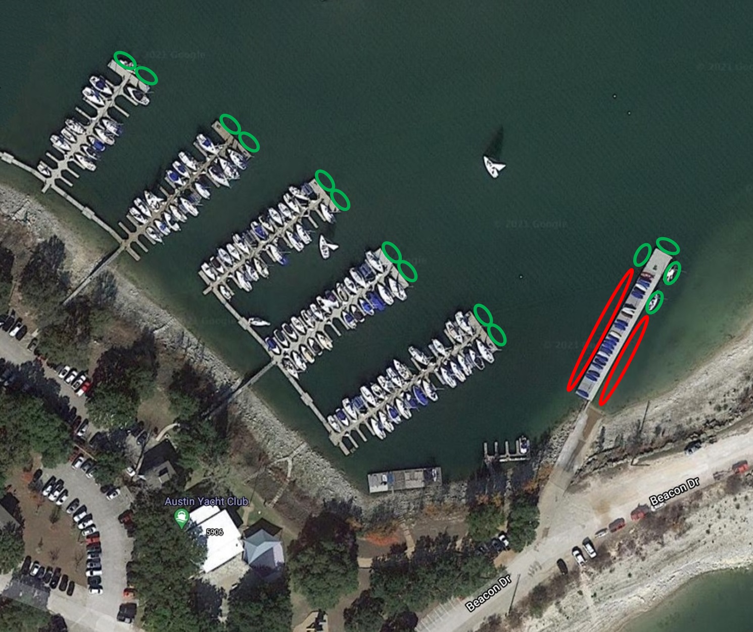 The Austin Yacht Club has two (2) mast cranes for raising and lowering your mast. Feel free to use either mast crane for this purpose. The red circles identify the location of the cranes on the map below.