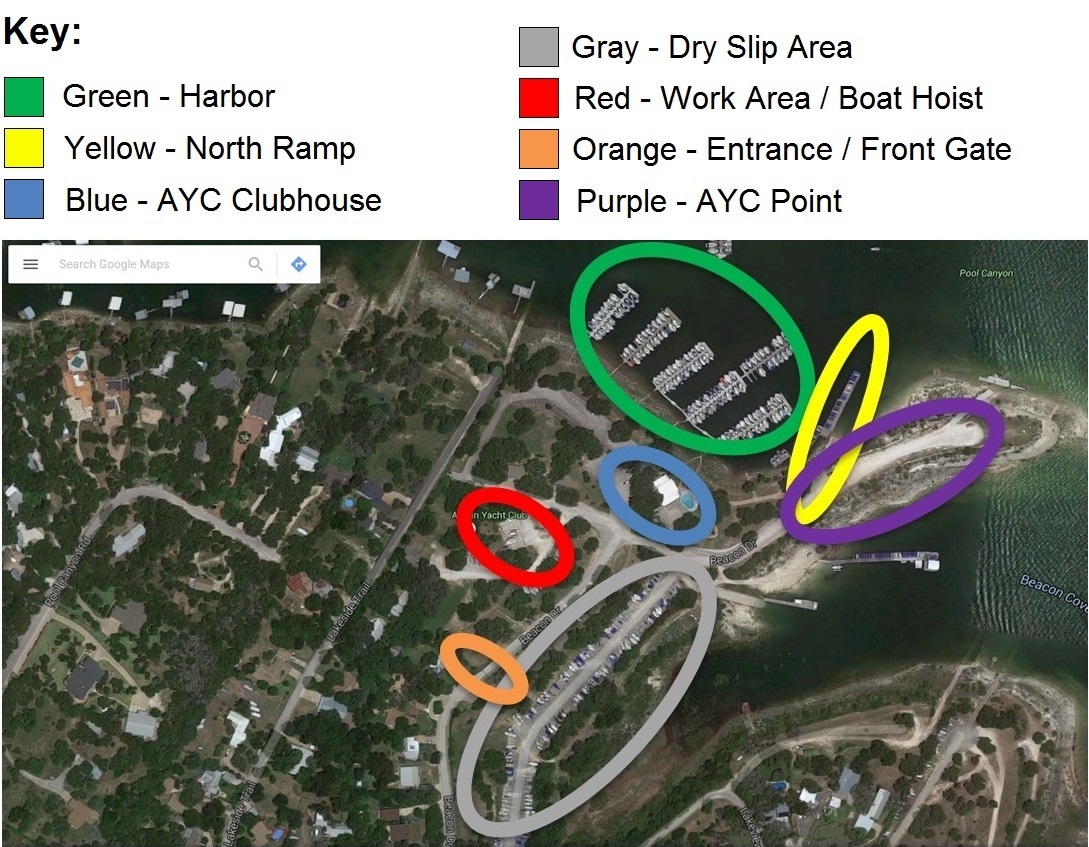 The map below shows the layout of the AYC grounds, including the locations of the front gate, the AYC clubhouse, the work area and boat hoist, the dry slip area for parking boats and trailers (by special prior arrangement), the AYC point for parking trailers (for those who have not made other arrangements), the north ramp used for launching and retrieving, and the main AYC harbor.